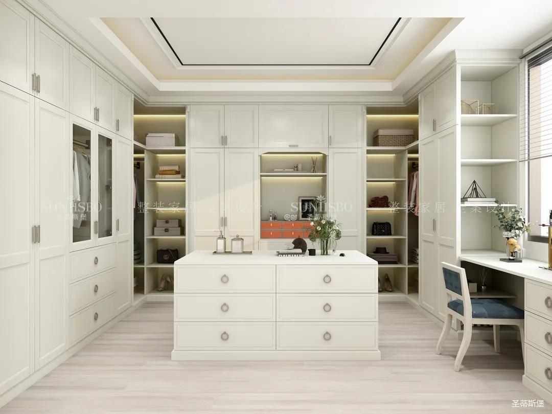 主卧侧面就是独立步入式衣帽间,以仿古白木质纹理布局形成美式轻奢主题,设计模块化的储物,散发着浓郁的实木清新感,予人以饱满而温柔的情绪,内嵌的智能感应灯带,让时尚与轻奢形成轻微碰撞,让收纳力max+的同时也呈现出满满的质感。